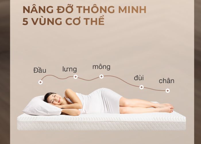 Đối với nhiều bạn trẻ còn mắc các bệnh về xương khớp thì không nên bỏ qua dòng nệm trị liệu nâng đỡ cơ thể. Nệm cao su 5ZONE cũng là một trong những dòng nệm cao cấp của nhà LIÊN Á dành riêng cho người hay đau lưng, nổi bật cùng thiết kế 5 vùng nâng đỡ trọng điểm: đầu, lưng, mông, đùi và chân, hỗ trợ xoa dịu tình trạng đau nhức cột sống.