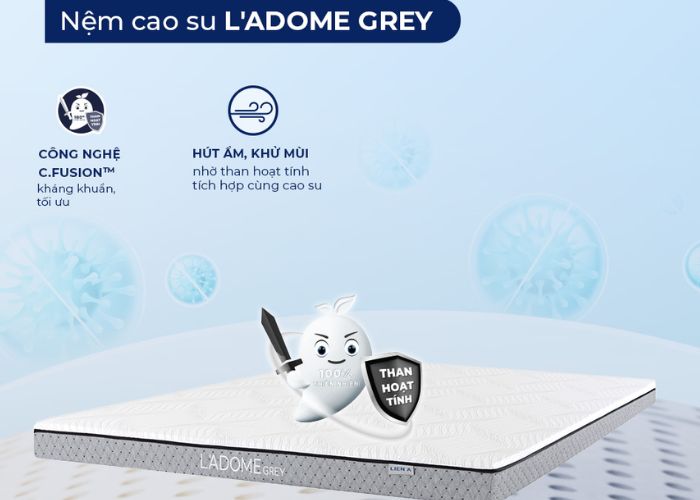 Nệm L’ADOME Grey là phiên bản cải tiến từ dòng L’ADOME quen thuộc của nhà LIÊN Á, được ứng dụng công nghệ C.Fusion Latex™ giúp dẫn truyền than hoạt tính sâu vào từng cấu trúc cao su. Nhờ vậy, nệm không chỉ giữ trọn những ưu điểm vốn có của dòng L’ADOME mà còn có thêm khả năng kháng khuẩn, chống nấm mốc và khử mùi hiệu quả.