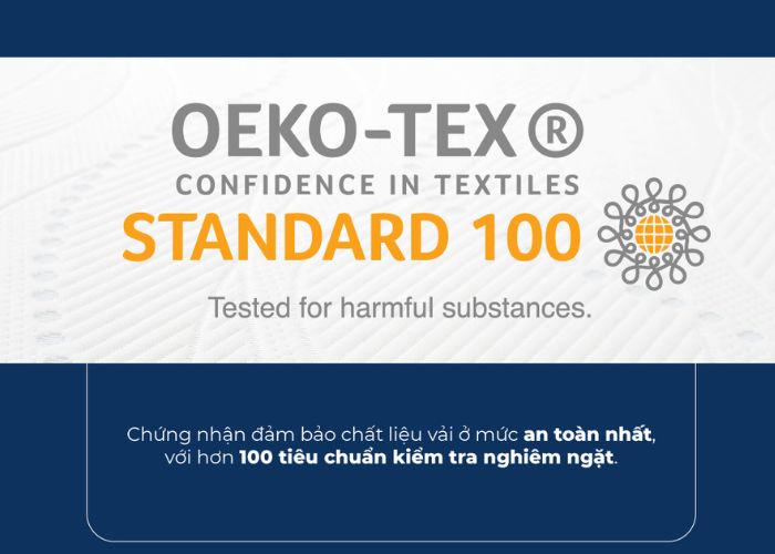 LIÊN Á luôn đảm bảo tiêu chuẩn an toàn cao nhất bằng cách kiểm soát chặt chẽ nguyên liệu vải ngay từ khâu đầu vào. Tất cả các sản phẩm dệt may như drap, áo nệm và vỏ gối đều được nhập khẩu từ những đối tác quốc tế uy tín cũng như phải đạt chứng nhận OEKO-TEX® Standard 100, bảo chứng cho sự an toàn với làn da và sức khỏe người dùng.