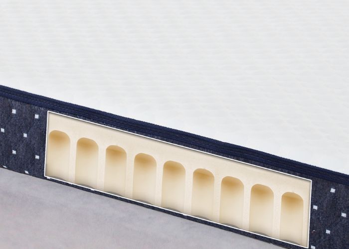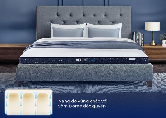 Dòng nệm cao su L’ADOME gây ấn tượng với cấu trúc mái vòm (DOME) được lấy cảm hứng từ kiến trúc Địa Trung Hải. Thiết kế này giúp phân tán lực đều khắp bề mặt, hỗ trợ cột sống giữ đúng tư thế và phù hợp với nhiều vóc dáng cơ thể. Nhờ sử dụng 100% cao su thiên nhiên, L’ADOME mang đến độ đàn hồi bền bỉ, nâng đỡ tốt và tạo cảm giác êm ái khi nằm.