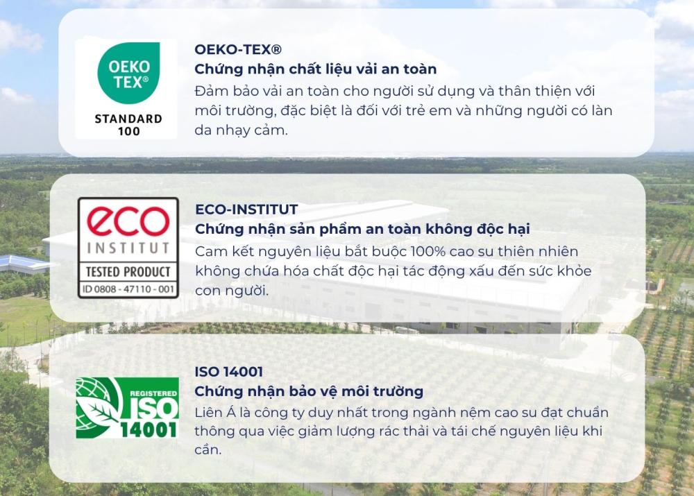 - OEKO-TEX® Standard 100: Toàn bộ áo nệm của LIÊN Á đều đáp ứng hơn 100 tiêu chí kiểm định nghiêm ngặt liên quan đến độ an toàn dệt may. Hằng năm, thương hiệu còn chủ động gửi mẫu đi kiểm nghiệm để duy trì chất lượng ổn định và đảm bảo sản phẩm luôn đạt chuẩn quốc tế.